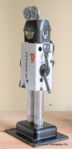 he comenzado a construir una serie de robots que tienen circuitos simples en ellos. Este one,Mr.Philips,has un circuito Joule Thief con 3 cabeza roja de la LEDs.The proviene de una antigua Philishave máquina de afeitar, el cuerpo es una carcasa de aluminio de radio vintage.