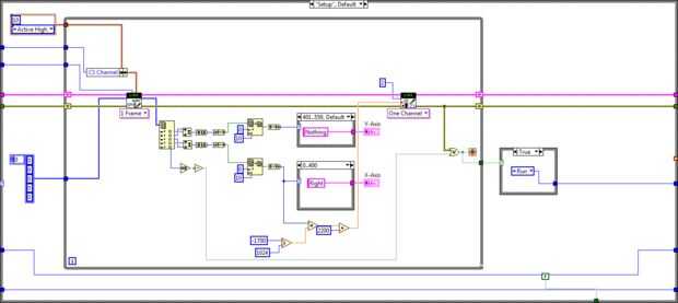 El último byte de la PmodJSTK contiene información sobre los botones de a bordo. Si ninguno de los botones se presiona, este valor es 0. Si uno o todos los botones se presiona, este valor es distinto de cero. Así el estado de la instalación se termina cuando se presiona un botón en el Pmod porque el byte resultante será distinto de cero, dando por resultado un valor false desde el bloque de comparación. El bloque "no" se utilizó para cambiar este valor en true y luego el verdadero valor es enviado a detener el tiempo bucle. El verdadero valor se alimenta también en una estructura case después del tiempo bucle que envía el estado de "Ejecutar" en la estructura principal de caso utilizando el registro de desplazamiento.