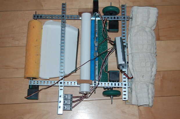 El robot utiliza un rodillo de pintura para recoger las migas y la suciedad y los mueve en un recogedor. También, un tanque de agua gotea continuamente agua sobre un trapeador que gira hacia adelante y hacia atrás. Arrastrando detrás del bot es una toalla que se seca la planta y recoge la suciedad restante.