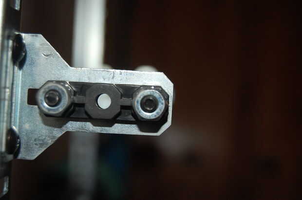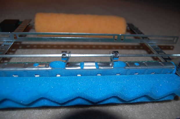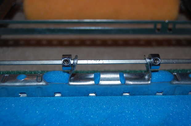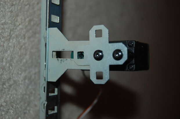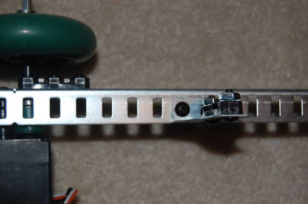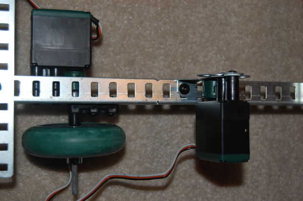 Para colocar la fregona, en primer lugar, atornille un soporte en L a cada lado, cuatro orificios de la rueda del árbol de la. Atornille el motor servo para un soporte de X con el soporte entre el motor y el soporte de X. En el soporte de L contrario, tornillo en un soporte de eje negro. Luego tomar la RP y recortar los extremos con un cuchillo para que la unidad se ajusta a la anchura del marco. Ligeramente curva dos lengüetas de la fregona del uno hacia el otro; Esto mantendrá por lo que se mueve con el eje. A continuación, tomar un eje de 12 pulgadas y resbálelo a través de la abrazadera en L, a través de las lengüetas de la fregona y en el motor. Utilice un collar de parada para sostener el eje en su lugar. Puede que necesite utilizar pegamento caliente para que la fregona se mueve con el eje.