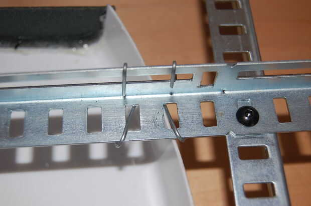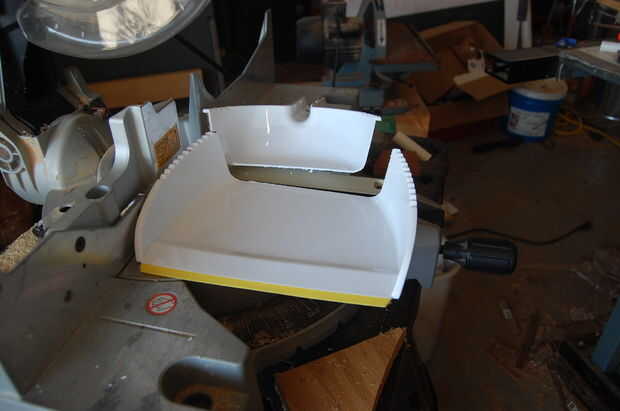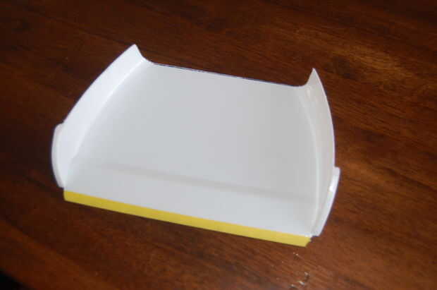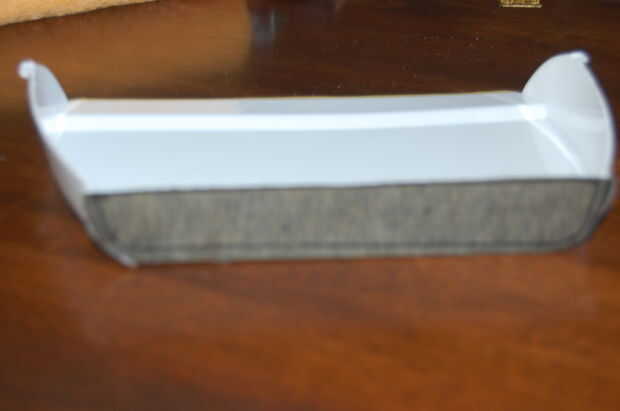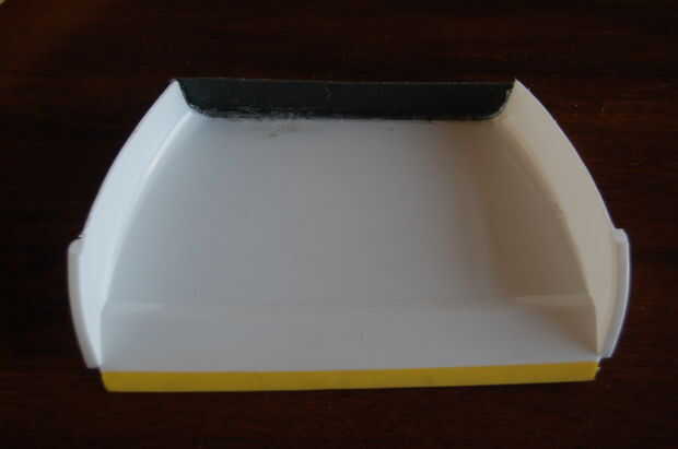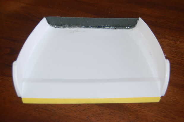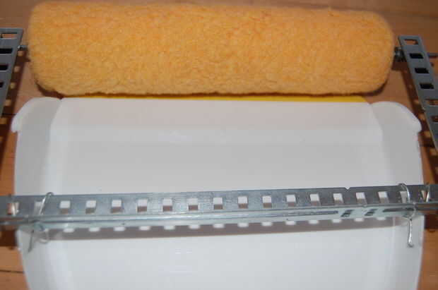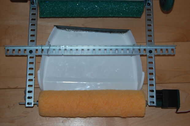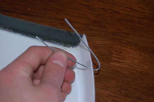 Now you can add the dustpan. Primero se corta el asa y unas pocas pulgadas de la parte trasera por lo que cabe en el marco. Luego corta los lados por lo que se trata de una pulgada y media de alto. Utiliza una sierra de vaivén para cortar el mango y utiliza una sierra de fundición para cortar los lados, pero una sierra de mano funcionaría bien. Luego tome un pedazo fino de madera y cortarlo para que coincida con la abertura donde el mango solía ser y utilizar pegamento caliente para pegar en. A continuación coger un soldador y hágale un agujero pequeño a través de ambos lados de la pala, sobre una pulgada de la parte posterior y un centímetro de la parte superior. Luego cortar un pedazo de 6 pulgadas de alambre achique, pase la mitad de él a través de un agujero y doble para cumplir con los dos extremos. Hacer esto para ambos lados. Luego colocar el recogedor en la derecha del marco contra el rodillo de pintura y envolver el alambre alrededor de la viga horizontal. Cuando termines, el pan debe poder girar para que más fácilmente se puede volcar a la basura.