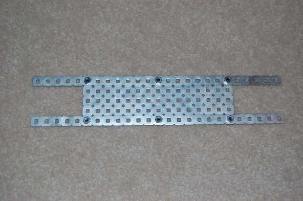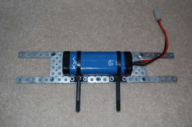 Para hacer el montaje de la toalla, tome dos de las vigas rectas que son solamente 1 orificio amplio y atornillarlas cada uno a un lado de una plataforma de 5 x 15. Luego atornille los soportes de la batería y coloque la batería en los soportes. Conecte un trozo de cable a cada extremo de una de las vigas (ignore la cadena en el cuadro). Coger una toalla que es el ancho de la viga largo y dóblela alrededor de la batería y la plataforma. Fijarla con unas ataduras alrededor de la toalla. Acabado el paquete de toalla envolviendo el otro extremo del alambre a la parte posterior de la viga, en el robot.