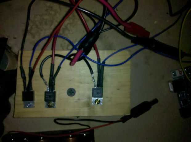 Para obtener el trabajo de los MOSFET, tira y soldar un alambre fino en el eje izquierdo (véase imagen), un cable rojo en el centro y dos cables negros a la derecha (una de ellas se conectará a tierra en el protoboard y el otro se conecta a la batería/motor. Luego, tira y conecte un conector rojo de Anderson el otro extremo del cable rojo y un conector negro de Anderson al otro extremo del cable negro. Por último, conecte el MOSFET a la batería y el motor. Conecte uno de los cables negros en la tierra en el protoboard y conecte el cable negro con el conector Anderson a la batería. Conecte el cable rojo con el conector Anderson el motor (véase imagen). Hacer lo mismo para los otros MOSFET.