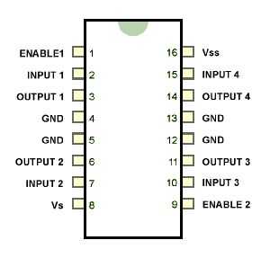 L293D contiene dos circuitos, driver puente H incorporados. En su modo común de la operación, dos motores de corriente continua pueden conducir al mismo tiempo, tanto en dirección hacia adelante y hacia atrás. Las operaciones de motor de dos motores pueden controlarse por entrada lógica en pins 2, 7, 10 y 15. Entrada lógica 00 o 11 detendrá el motor correspondiente. Lógica 01 y 10 la girará en el sentido horario y antihorario respectivamente.