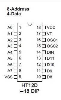 A0-A7: Estos son la entrada de dirección. Estado de los pines debe coincidir con el estado del perno de dirección en HT12E (usado en el transmisor) para recibir los datos. Estos pines pueden ser conectados a VSS o abiertos
