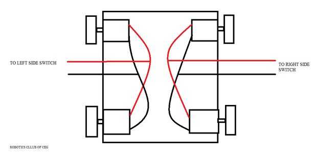 Aquí utilizaremos la unidad diferencial o impulsión de cuatro ruedas para controlar nuestro robot. En el que se conduce los cuatro motores al mismo tiempo para conseguir todos los cuatro controles básicos (adelantados, atrás, izquierdos y derecho). Wilh un caso especial de izquierda y derecha (arco de izquierda y derecha del arco). vamos a discutir esto en detalle más adelante. en cuanto a la conexión del motor, tenemos que acoplar los dos motores a cada lado del chasis. Para esto, considere los dos motores del lado izquierdo. alimentación con batería y averiguar los dos terminales a los que + y - terminales de la batería es tal que el motor gira (decir agujas) igualmente hacerlo por otro motor y tome nota de la conexión. conectar dos terminales para que + ve terminal de la batería fue conectada y dos otros terminales para que ve - terminal de la batería fue conectada y ahora tenemos sólo dos terminales en cada lado. al abastecimiento de la fuente utilizando la batería, motores de un lado giran en la misma dirección. Realizar la configuración similar para los otros dos motores del lado derecho del chasis. Haya terminado con la conexión del motor.