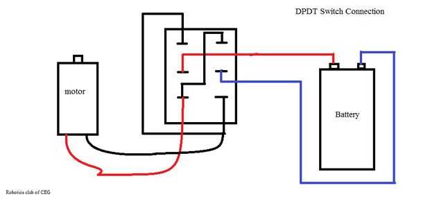 Desde ahora estamos familiarizados con el funcionamiento del interruptor de dpdt, ahora procederemos con la forma de conectarse este interruptor para hacer nuestro robot manual! como sabemos el interruptor dpdt tiene 6 terminales. Las clavijas se conecta de una manera tal como se muestra en la figura dependiendo de la forma en que se presiona. Para controlar el motor ambos sentidos (horario y antihorario) necesitamos este interruptor. La terminal del centro del interruptor está conectado a la batería mientras los terminales extremos al motor como se muestra en la figura. Esto se hace para un lado! Realizar otra conexión similar para el otro motor de lado.
