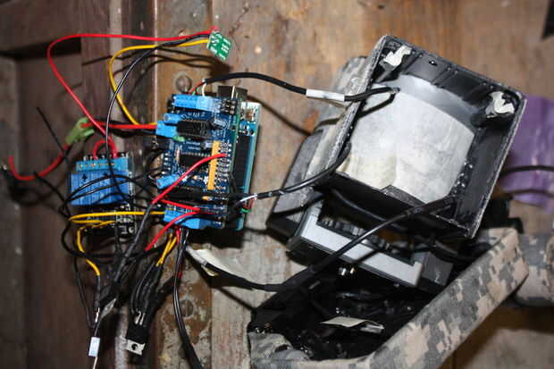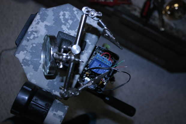 -Linterna laser combo -estos no pueden ser alimentados por la motorshield solo, usted necesitará utilizar un regulador de voltaje como el chip ajustable Step Up/Step inicial voltaje regulador S8V3A. Cableado la Pololu regulador S8V3A: Enganche el voltaje en el lado positivo de bloque de tornillo de alimentación externa de Motorshield directamente a. Gancho de la tierra directamente en el lado negativo del bloque de tornillo de alimentación externa de Motorshield. La tensión de salida puede usarse para ejecutar el módulo láser y linterna, pero sólo después de que ha sido sintonizada alrededor 3.5 - 4v para evitar dañar las luces y láser. Linterna: Solde el cable positivo a la tensión de la S8V3A. Soldadura la negativa hacia el colector de un punta-120 y el emisor a carril de tierra de motorshield. Base de punta 120 debe soldarse al pin Nº 13. Módulo del laser: Solde el cable positivo a la tensión de la S8V3A. Soldadura la negativa hacia el colector de un punta-120 y el emisor a carril de tierra de motorshield. Base de punta 120 se debe soldar al pin Nº 2.