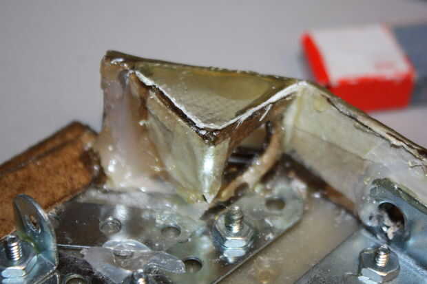 Añadir unos trocitos de tela de fibra de vidrio para cubrir el interior de los soportes de acero y agregar una capa de resina en la parte inferior.