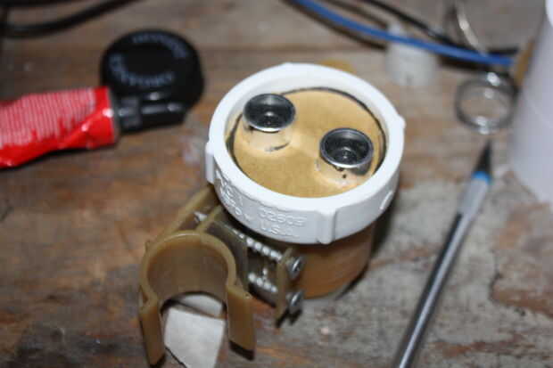 Después de que la pintura esté seca, haga un nudo en el sensor de ultrasonidos cableado aproximadamente 3 pulgadas del sensor, esto evitará que el cable jalando la conexión al sensor. Pase los cables a través de adaptador de PVC y el soporte de la manguera del radiador. A continuación, tome la cara del sensor ultrasónico y pegar en la parte delantera del adaptador de PVC.