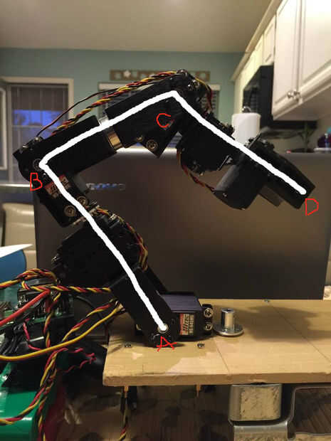 Utilizando las propiedades básicas de la trigonometría; inverso; Yo era capaz de predecir que la coordenada del punto D sería si tengo control sobre el ángulo dependiente en este caso que yo soy. En teoría, si sé la coordenada del punto D entonces puedo resolver para el ángulo requieren entre cada articulación. Y probó en el papel.