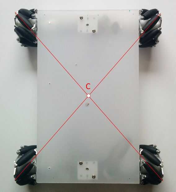Ruedas de Mecanum deben instalarse de la manera correcta. Una configuración correcta requiere que cada una de cuatro ruedas de mecanum es establecer de la manera como se muestra en la foto. El eje de rotación del rodillo superior de cada rueda debe cruzar el centro del chasis del robot (punto C).