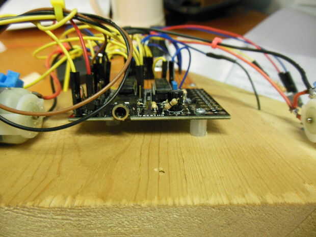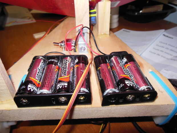 Utiliza dos fuentes de alimentación. las potencias de 4,5 voltios el Picaxe y los 6,0 voltios alimenta los motores (2 servos y 2 ruedas). Este hecho conectando el los cables rojo y negro del soporte de la batería a las entradas apropiadas en la placa Picaxe. La documentación de Picaxe dice que la resistencia debe cortarse si usando fuentes de energía independientes (ver foto).