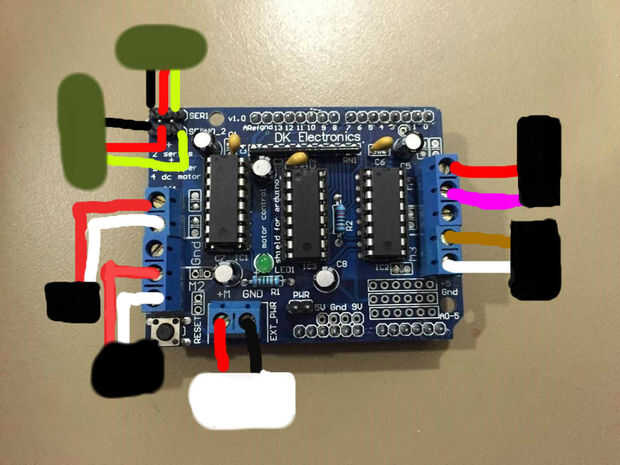 Un verde LED está conectado al pin 2 de Arduino (según el escudo manual ese pin no está implicado en el control de los motores) y el conector de tierra.