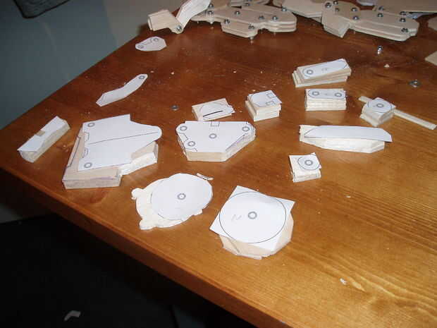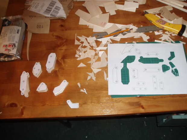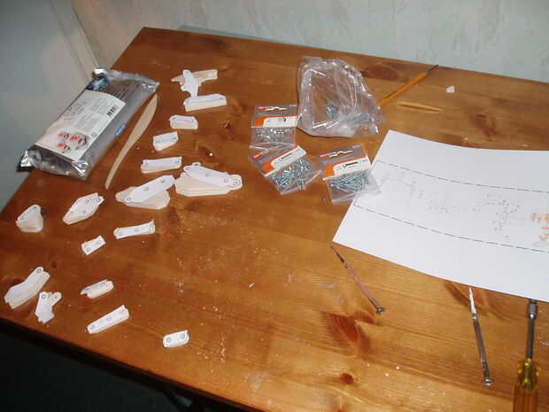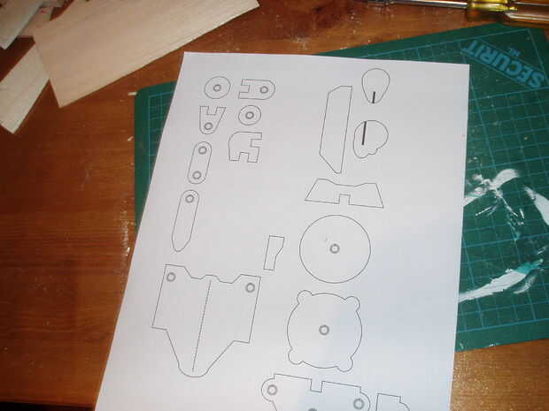 Cuando se imprime la hoja parte cortar las piezas con el papel. Trazarlos con un lápiz sobre la madera de balsa 2, 5 mm. Corte la primera pieza de la madera y después de la primera pieza la utilizan como un pedazo de padre. Ahora empezar a hacer del bebé! copiar las otras piezas solamente del padre, para que todas las piezas son de la misma forma. Esto es crucial!