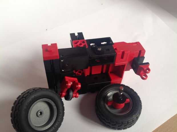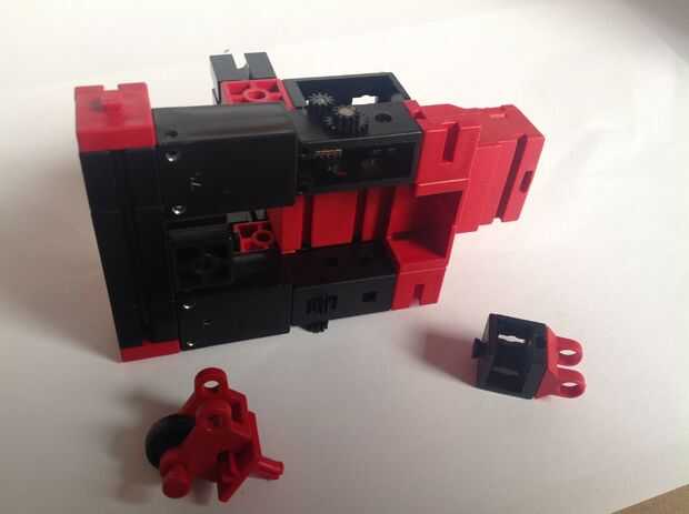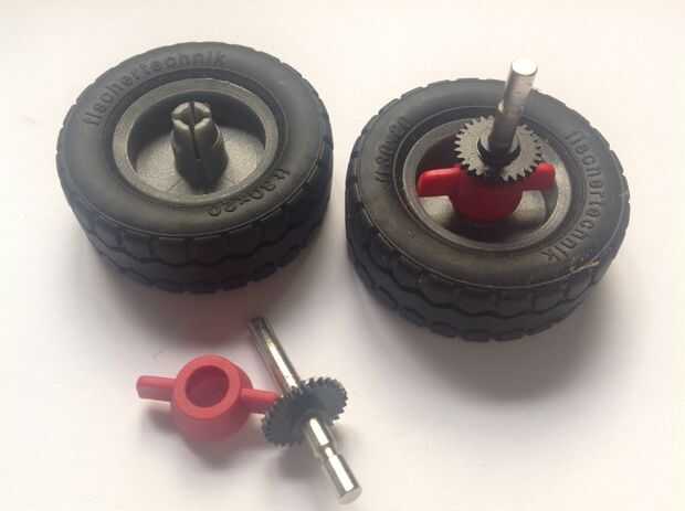 Ensamblamos las dos ruedas, como reciben ver en la imagen, sobre la misma rueda le añadimos el eje con el engranaje y lo aseguramos roscando con la mano la pieza permiso de color rojo.