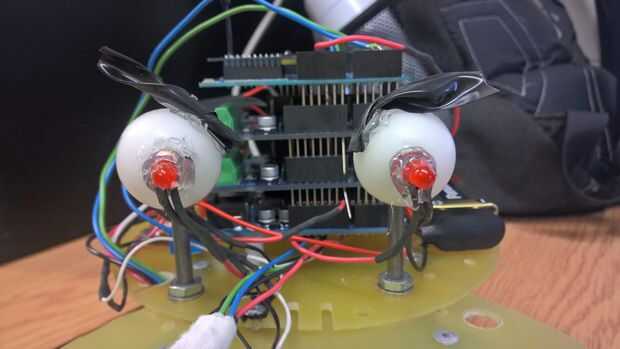 3. Pegamento en dos LED 5v rojo y trenzada cinta aislante para utilizar como cejas enojadas en los dos rodillos