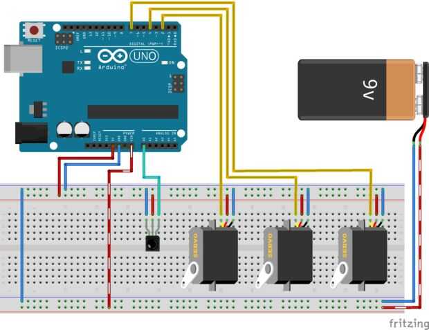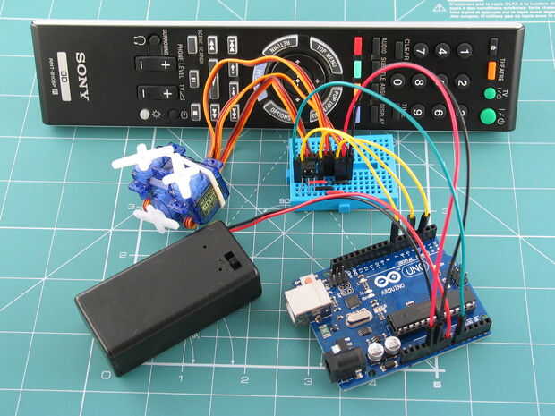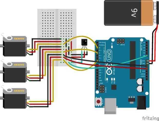 Ahora vamos a probar nuestro prototipo. Presione el botón "adelante" en el IR remote. Verás que los 3 servos han comenzado oscilante proceso alrededor de la posición de 90 °. Presione los botones de colores y comprobar ese período de cambios en el proceso de oscilación. Velocidad lenta y presione "hacia atrás". Usted verá que servo central cambió su fase.