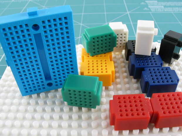 Lo 1 º: se puede comprar. Tipo "kit pequeño protoboard" en navegador y encontrará los bloques de Lego-como mismo como ves en mi foto. Sí, soy afortunado, tengo algunos. Los bloques son pernos 5 x 5. Hay 10 cuadras en un juego y necesitamos dos. Pegamento y tablero de 5 x 10 pins está listo. Pero hay un inconveniente: estos breadboards son infrecuentes. Y tal vez usted no podía encontrar cerca de su casa.