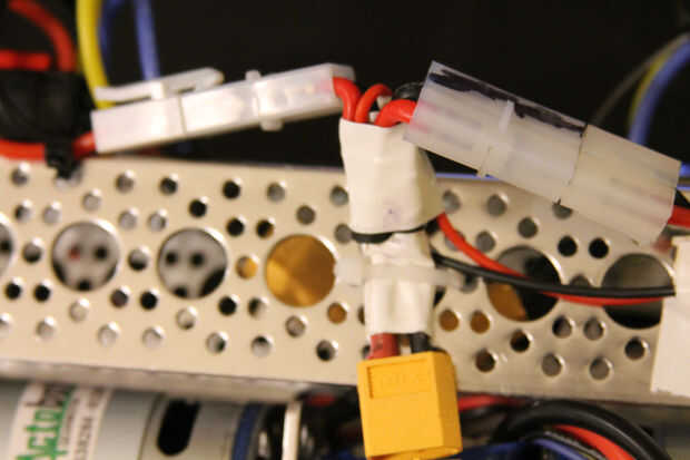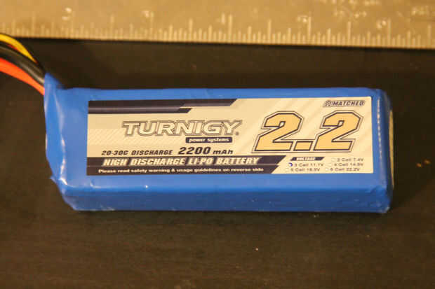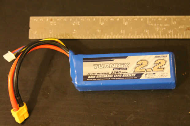 Yo uso un Turnigy 2200mAh 3S 20 C Lipo Pack con conector XT60. Soldado una hembra XT60 para algunos conectores estándar de RC que se unirá a los CES más adelante. Parece un poco chapuza pero funciona. Preste atención al positivo y negativo obviamente. Fácilmente puede arruinar su ESCs o batería creando un corto circuito o conexión de las cosas al revés.
