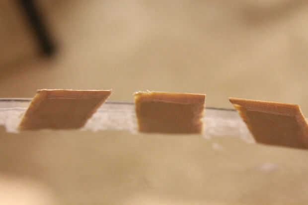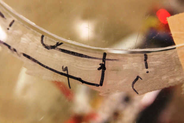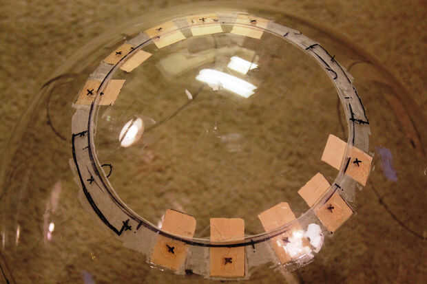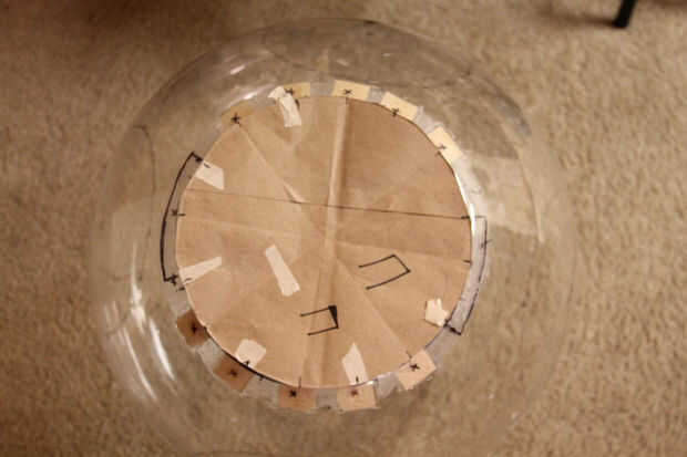 Se necesita 2 x - 18. Globos de acrílico transparente - con 8. Apertura de collares - americano 3202-18020-017. Use la apertura de una esfera como una plantilla para cortar un círculo de la otra esfera (8"). Usé una dremel herramienta de lijado para marcar el interior de la abertura para que epoxy pegarán mejor. Cortar 8 rectángulos de 1/16 madera balsa gruesa (puede utilizar la caja cutter/cuchillo). Los rectángulos son 1 "x 1-3/4" cada uno. Con resina de 5 minutos, pegue los rectángulos en el interior de la esfera como se muestra. la colocación de las "lengüetas" de madera permiten el robot se deslice dentro y fuera de la esfera. Biselados los bordes de las pestañas hasta más adelante las ruedas pueden arruinar sobre ellos más fácilmente.