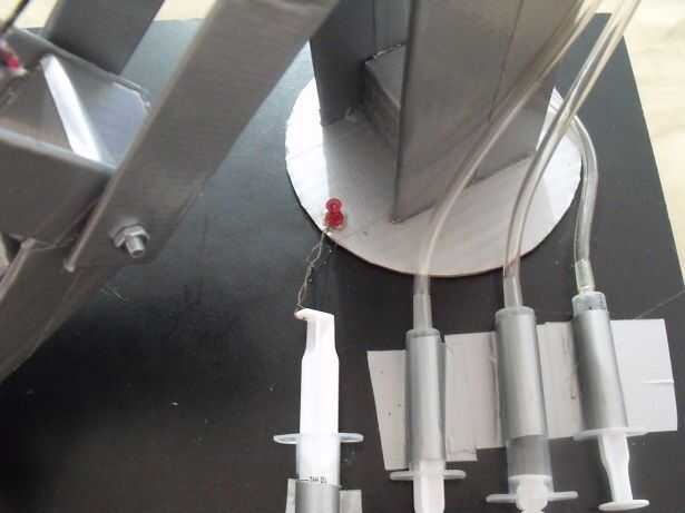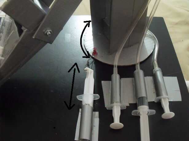 Ahora la cinta a la base 3 jeringas al lado del otro, cada uno de estos son para ser conectado a la jeringa en el brazo de madera