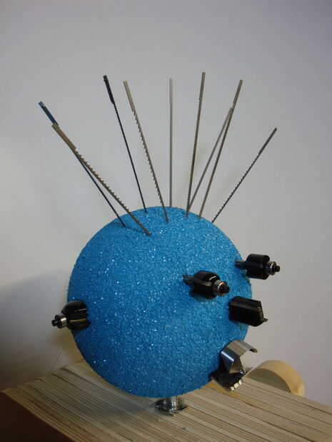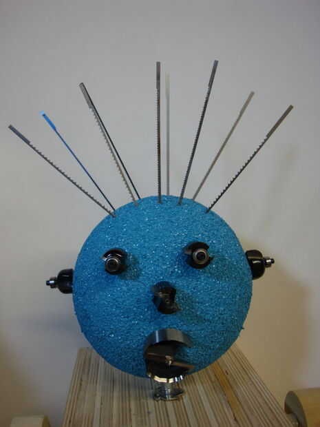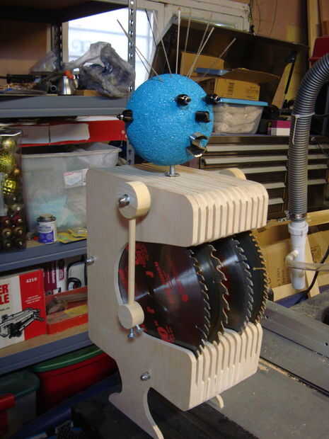 Una vez que se junta el cuerpo encontrar el punto central de la parte superior del cuerpo y perfore un orificio de 1/2", 1/2" de profundidad. Ahora inserte la tuerca de t de 3/8" en el agujero. Ahora corte el 3/8" todos hilo a una longitud de 2 1/2" de largo. Luego introdúzcalo en el orificio del cuerpo. Ahora para la parte más fácil. Haz una bola de espuma de poliestireno de 6" y pintarlo con el color deseado de la opción. A continuación, inserte las brocas router en la bola para formar un diseño de la cara y orejas. Por último, inserte sus hojas de sierra en la parte superior de la cabeza para que se vea como el pelo. Una vez que está todo entonces Introduzca las hojas de sierra en su vientre.
