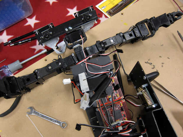 Compramos un kit de Robot humanoide Kondo KHR-3HV de Kondo en Japón (http://kondo-robot.com/sys/). Luego modificado el torso para acomodar las computadoras, mayor batería y electrónica relacionada y crea una inclinación cabezal para dar cabida a las dos cámaras. La electrónica consiste en un par de placas de PCB personalizados diseñamos integrar y alimentar los dos equipos de Blackfin de 500 MHz con el embedidos.