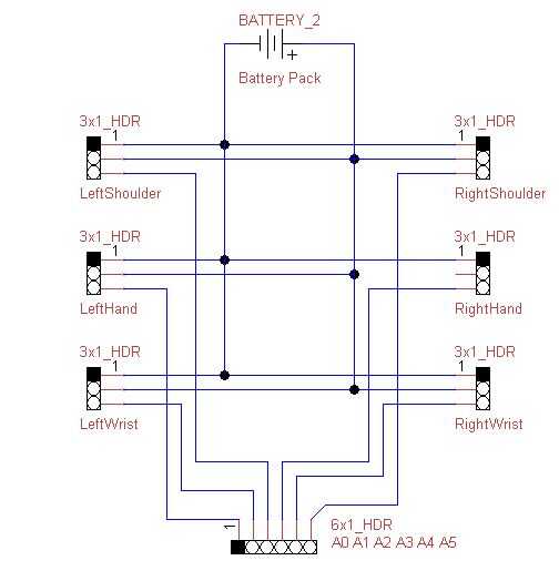 2. Inicie tomando un protoboard pequeño y conectar los cables de la batería, positivos y negativos, a la protoboard. Conectar todos los positivos de cable de servo a la línea positiva de la batería. Lo mismo para la tierra. Luego conecte las líneas de señal de cable de servo a los pines de Arduino adecuados. El diagrama esquemático demuestra todo. También puede tomar un vistazo al código para ver que servo se une a que pin del Arduino.