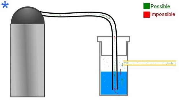 Usted puede conectar todos juntos. Llene la caja de la medicina con un poco de agua. La idea es que intercambio de gases tiene lugar a través del agua. Será por lo tanto imposible que la llama a través del agua y hasta para explotar la bombona (vea la * fotos).