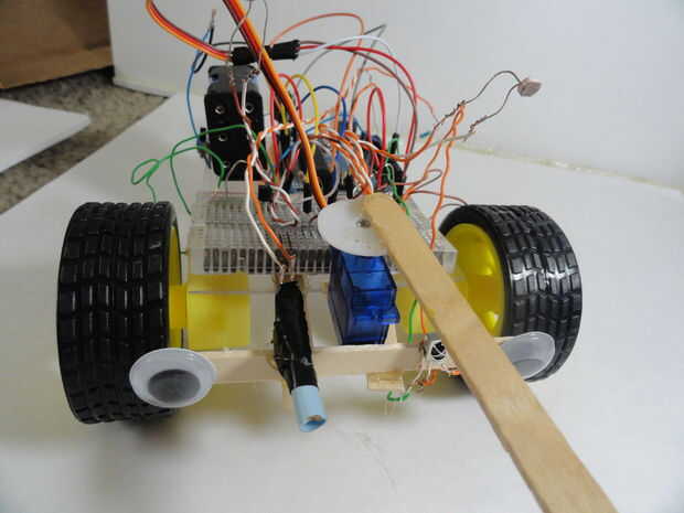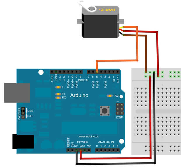 Cable del servo en el Arduino y protoboard como se muestra a continuación. Es fácil de usar los cables de puente y pegarlas en el extremo del conector del servo y luego en la protoboard o arduino.