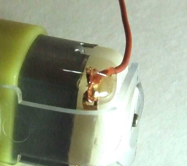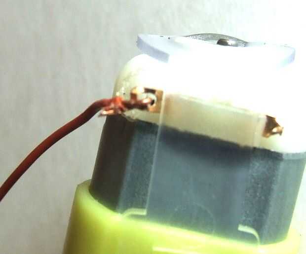 Encontrar el motor, que ya se coloca dentro de la caja amarilla, pero se puede sacar si lo desea para otros proyectos. Conecte un par de cables trenzados a lengüetas de metal del motor primero los extremos de los cables y luego insertarlos a través de los orificios de las lengüetas. Normalmente esto se hace usando una soldadura arma sin embargo trabaja bien para insertar el alambre por el orificio y sujete firmemente el alambre alrededor de ella usando alicates de punta. Tenga cuidado de no torcer la ficha del motor porque se podría romper. Una vez que está conectado firmemente, coloque una gota de pegamento caliente sobre él para mantenerlo en su lugar.