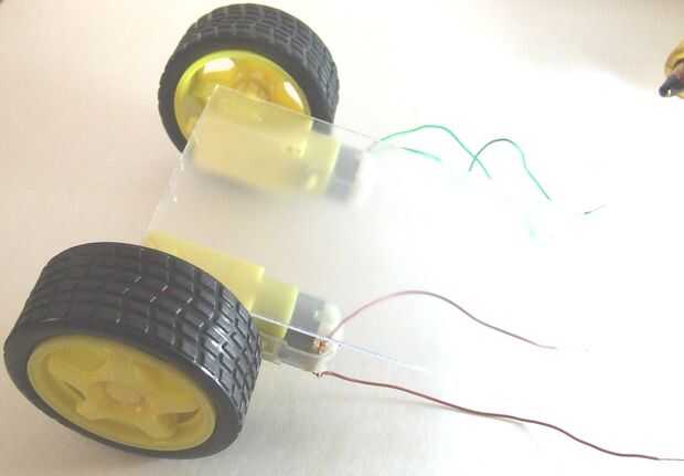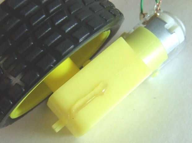 Conecte la caja de engranajes del motor al chasis. Esto puede hacerse usando un poco de pegamento caliente en el chasis y presionando el motor de engranajes en él. Asegúrese de usar un poco de pegamento caliente de otra manera podría ser difícil de bajar si tiene que cambiarse. Alinee las dos ruedas por lo que naturalmente va a conducir en línea recta. Está bien si desvía hacia un lado un poco porque es impulsada por sensor y auto uno mismo-corregir.