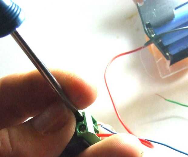 B) ahora toma el otro cable de positivo o negativo de la batería dependiendo de que uno elige y alambre directamente a la toma de corriente. Desatornille los tornillos del conector de alimentación, doble el alambre desnudo en su propio alambre cubriendo, luego inserte los cables asegurándose de que negro está conectado con la etiqueta negativa y rojo está conectado a la etiqueta positiva. Esto debe crear un circuito con el interruptor de encendido/apagado y bloqueo de energía.