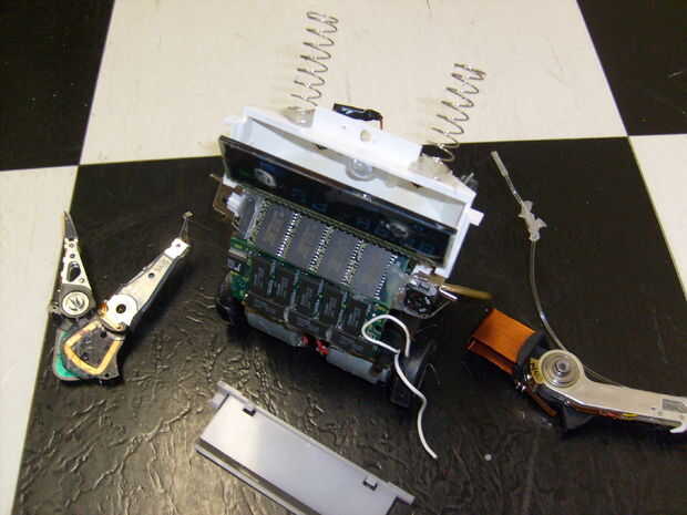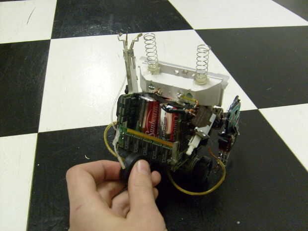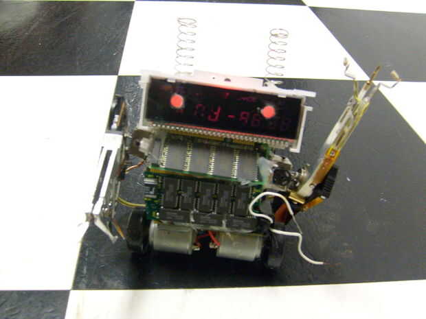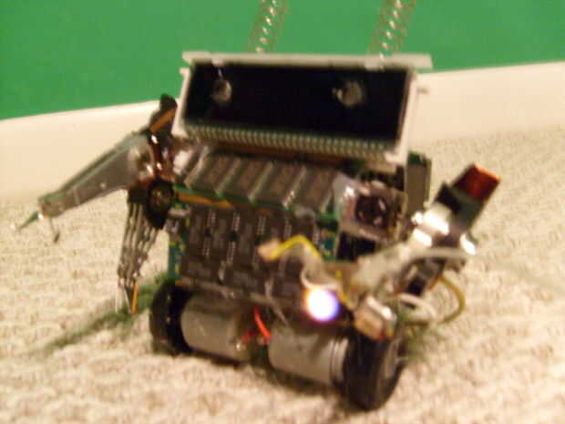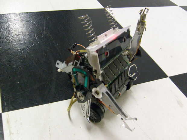 hice esta cosa hoy con piezas de 2 unidades de disco duros, un viejo reproductor de CD de Sony, un coche RC, tarjetas sim, un encendedor y un coche de pinewood derby. Está equipado con motores para hacerla mover, un lanzallamas y una cara de enciende con LED. Puedo conseguir la llama de lo lanzallamas mucho mayor pero mi encendedor fue agotando.