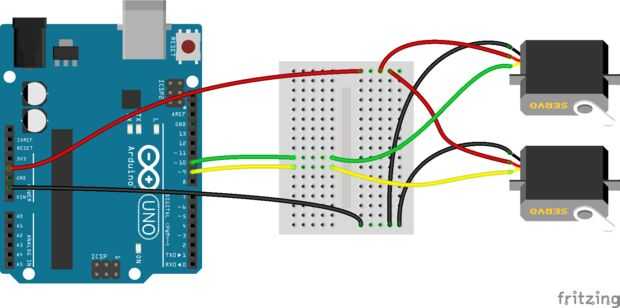 Luego conectas dos servos a la vez para controlar simultáneamente. Echa un vistazo en el diagrama de cableado.