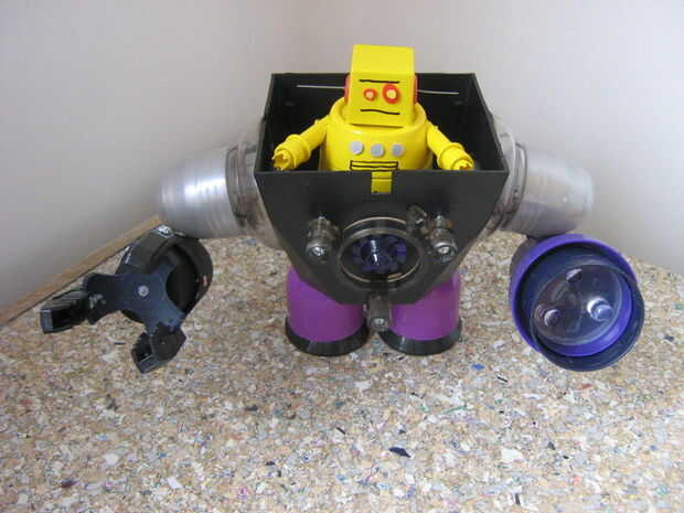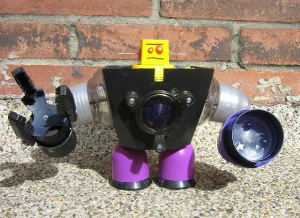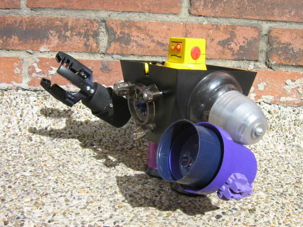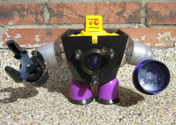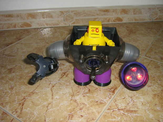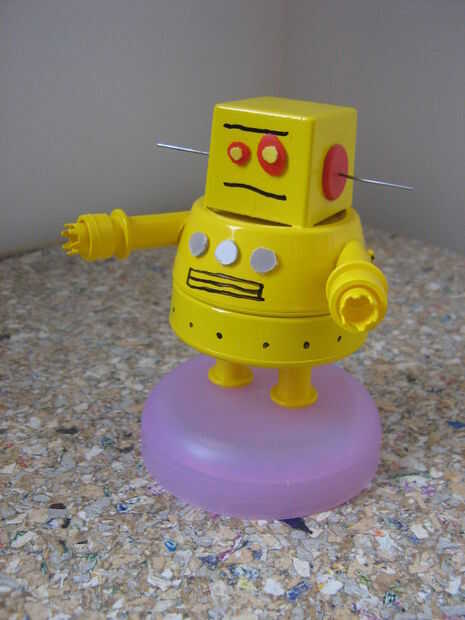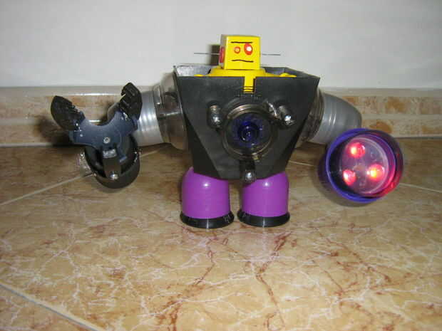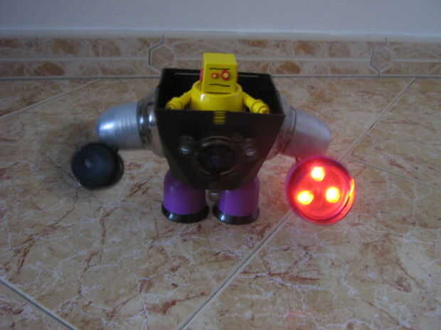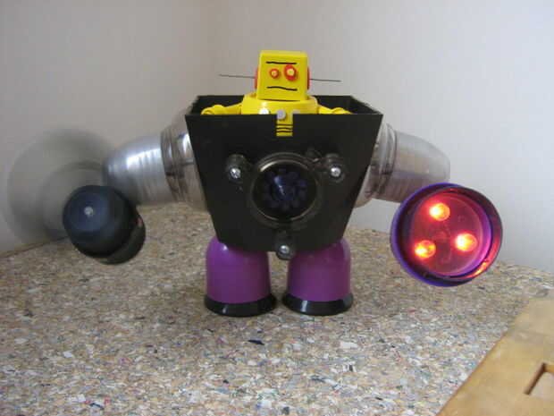 Básicamente, es uno de mis diseños vibrobots clásico de reutilizadas tapones de plástico y las perillas del horno. Su brazo derecho hace girar creando el movimiento, mientras que el brazo izquierdo tiene una triple LED raygun. Funciona con 2 pilas AAA.
