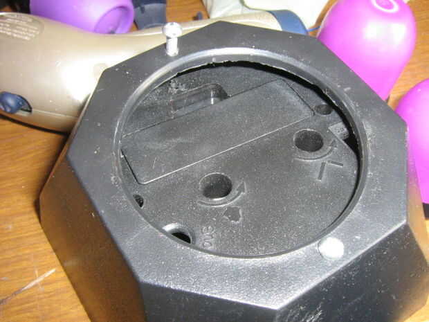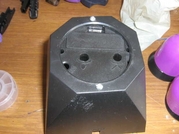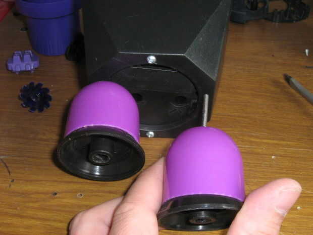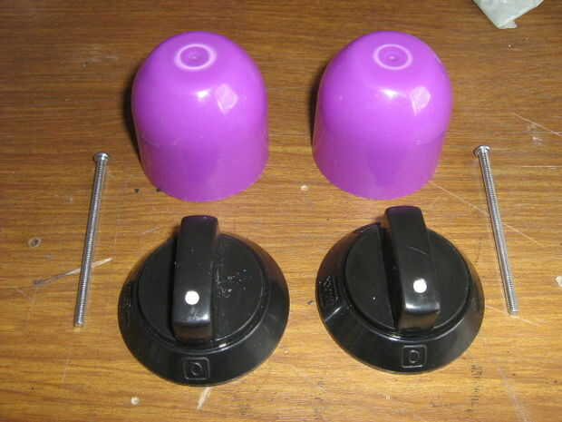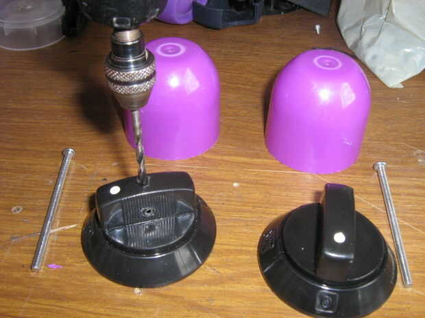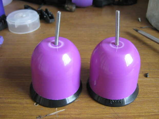 El caso plástico de la lámpara dañada será el cuerpo. Para cada etapa necesita un tornillo largo, una perilla de horno y una tapa de desodorante. Perforar el centro de la tapa y el botón, pase el tornillo y acople al cuerpo. Hacer dos piernas.