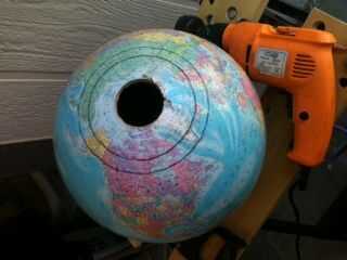 que corte dos agujeros en el globo con un fuerte par de tijeras de lata.  Que tenía el Ecuador del planeta huyendo de mis hombros en la parte superior de mi cabeza, así que utilicé el círculo polar ártico como una guía para el "agujero de la cara".  El agujero de mi cuello que acaba de comentar.