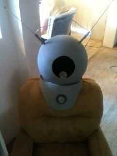 Las antenas se hacen de plata perchas con bolitas de metal pegadas en los extremos.  El alambre es algunos cable estéreo viejo que tenía puesta alrededor. Sólo pegar el cable con los tacos y pegado a los extremos a través de un orificio perforado en la parte posterior del casco. El "micrófono" en la parte delantera es una tapa de la botella de píldora con algunos agujeros perforados en él.  La perilla en el fron es otra tapa de la botella de píldora pegado.  La pantalla para ocultar mi cara es una pieza pura de nylon negro, como de un media de nylon.  Pinté todo battleship gris, que es más o menos lo que el cubo era de todos modos.