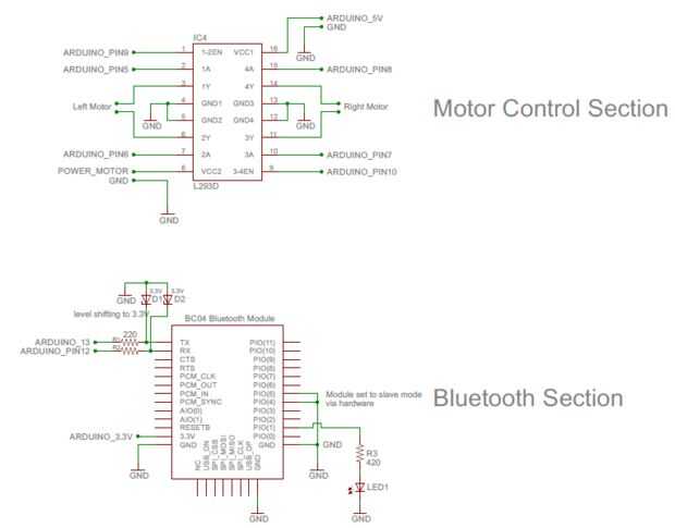 Usé la librería softwareSerial en un Arduino Uno para comunicarse con el módulo bluetooth y un IC L293D como conductor IC para los motores (véase el esquema)