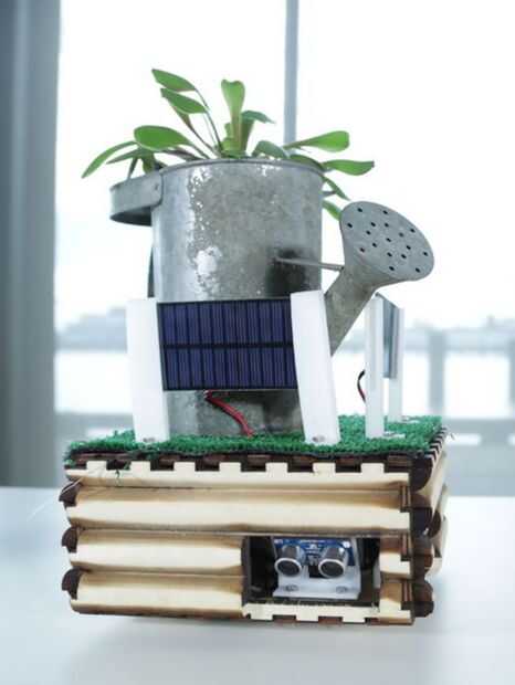 Su planta puede navegar hasta el lugar más asoleado en la casa con este sol busca Jardinera interior. Se ha controlado por un Arduino Micro y accionado por dos servomotores de rotación continua. El plantador trata de sol con la ayuda de dos paneles solares que detectan la luz del sol y distinguir el verdadero sol de iluminación interior. Dos detectores de la gama ultrasónica mantienen el plantador de topar con obstáculos o caída de cornisas.