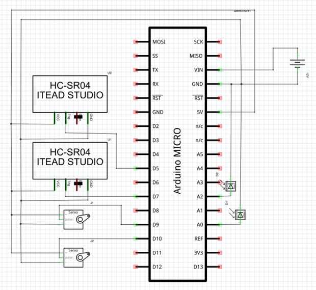 El circuito para este bot es muy sencillo. Un Arduino Micro controla el bot y es alimentado por una batería recargable de 12V. A continuación se enumeran los pines de Arduino se utiliza y las conexiones se muestran en el diagrama del circuito.