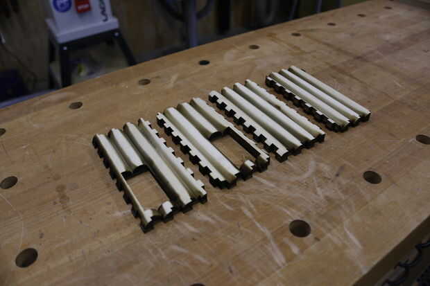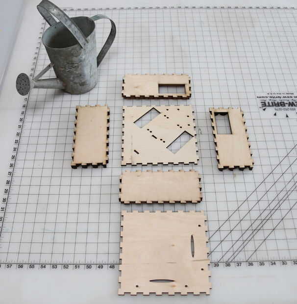 He diseñado la base de la maceta con Inventor y BoxMaker. El diseño es incluido aquí como un archivo de Illustrator. Para dan a la caja un "log cabin", cortar 1" gruesos tacos de madera por la mitad y pegados a un 3/16" pedazo de madera contrachapada. Se cortan las paredes de la caja de la madera contrachapada cubierta de espiga con un cortador láser de 450W. Sombreado agradable de la caja viene de depositarla el lado pasador de madera contrachapada en plataforma de la herramienta de corte láser. La parte superior e inferior de la caja se cortan de una pieza lisa de madera contrachapada de 3/16" con un cortador del laser 150W.