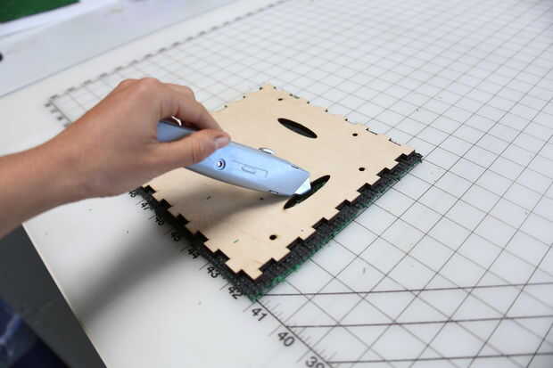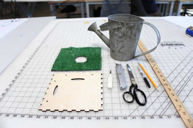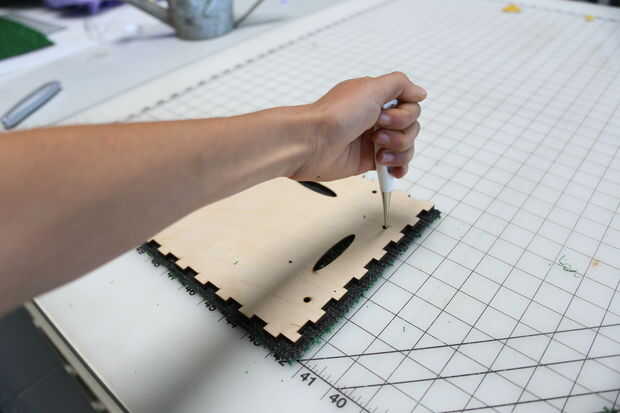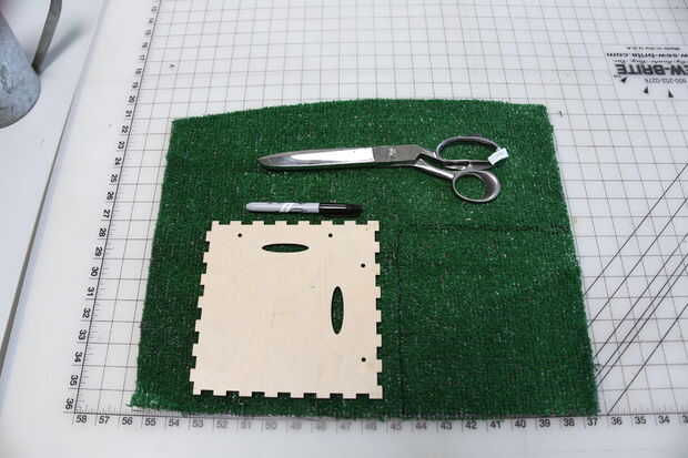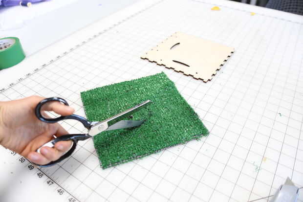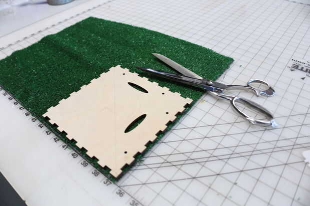 Utilice tijeras para cortar un 8 "x 8" pieza de césped artificial y colóquela en la parte superior de la caja. Corte ranuras con un cuchillo X-acto en el césped artificial a través de dos óvalos de la tapa. Los cables de los paneles solares del robot ejecutarán aunque estas aberturas y en la base de la maceta. Use un punzón para empujar los agujeros en el césped artificial. Tornillos, impulsará aunque estos agujeros para sostener 3D impresión piezas y montajes.