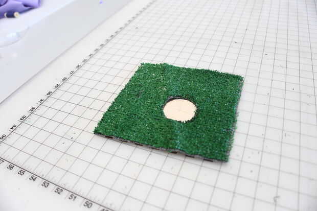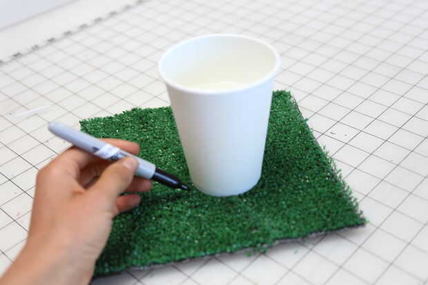 A continuación, haga una marca en el césped artificial donde se colocará la cubeta riego. Use una taza para dibujar un círculo alrededor de esta marca y cortar con un cuchillo X-acto.