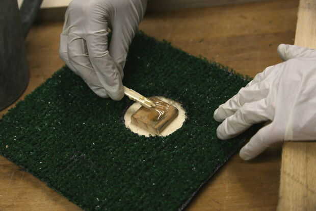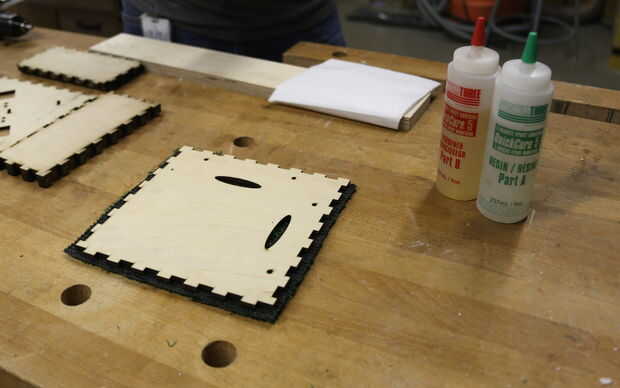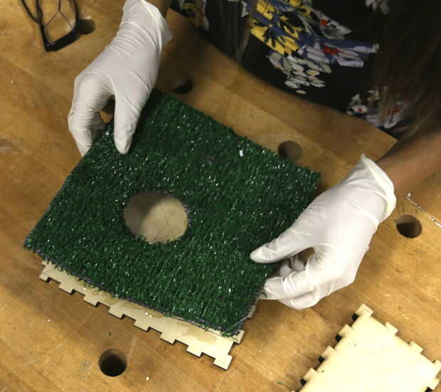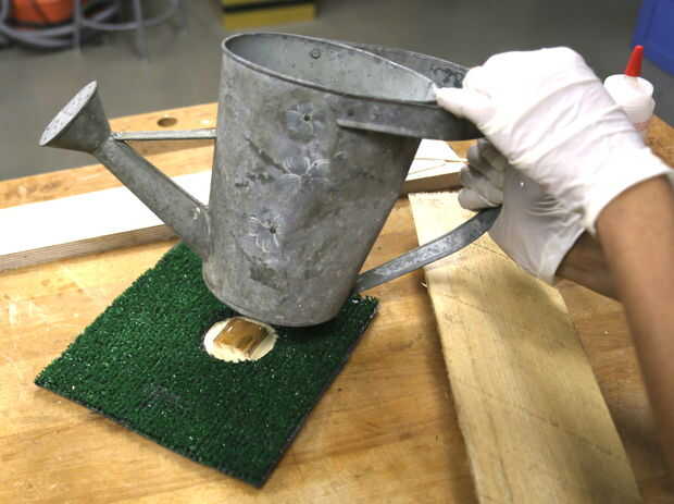 Utilice epoxi de dos partes para fijar el césped artificial y el cubo a la parte superior de la caja. Apriete el cuarto tamaño corone de epoxy juntos y mezclar. Aplicar epoxi sobre la parte superior de la caja, hierba endecha en el epoxi y pesaje abajo para asegurar la adherencia. Que el superior seco durante 30 minutos a 1 hora. Repita este proceso con el cubo. El cubo y la hierba deben tanto ser firmemente enlazados a la parte superior de la caja.
