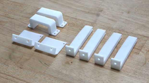 Diseñé los montajes y los soportes que se atornillan fácilmente en la base de la maceta. Aquí se incluyen los archivos de stl. Sensores de la gama ultrasónica se enroscan en soportes cuadrados que se colocan dentro de la base. Los montajes son en ángulo para que el robot sepa si está a punto de ejecutar en un objeto o caerse del borde de la mesa. Las células solares se deslizará fácilmente dentro de los montajes en forma de L que se atornillan en la parte superior de la base de la maceta. Abrazaderas de servo proteger servos del robot mientras que en el movimiento. Todas las abrazaderas y soportes están impresos en una impresora 3D de RadioShack Afinia.