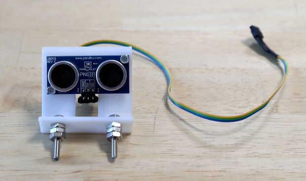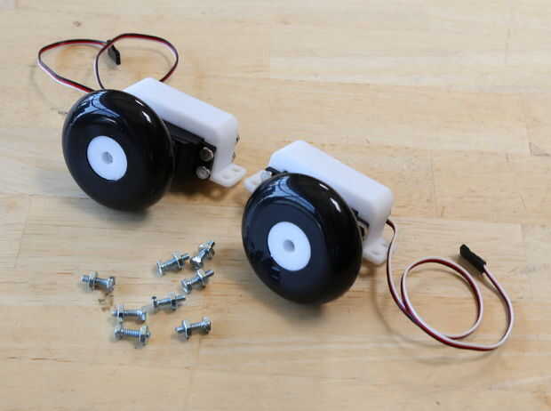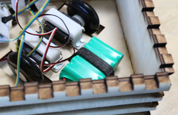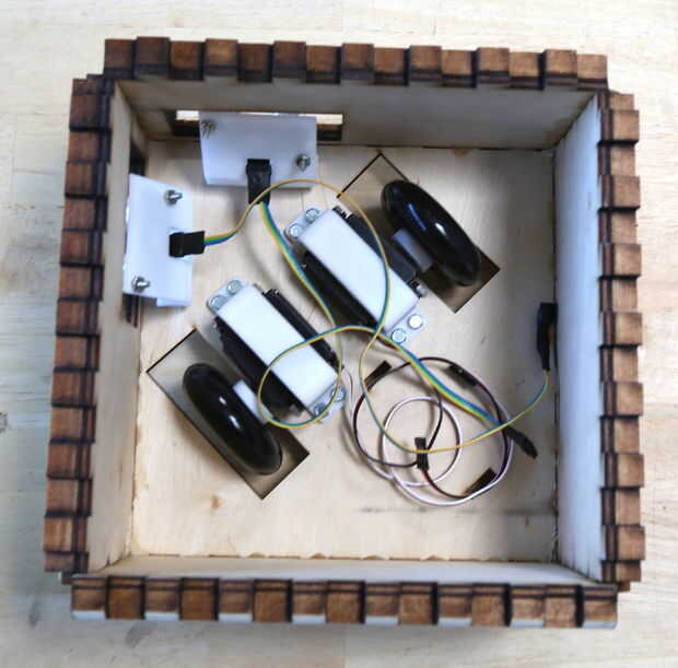 Fije la gama sensores y servos a sus monturas y garantizar a la parte inferior de la caja con tornillos. La correa por una batería recargable de 12V con un pedazo de velcro que se desliza a través de dos cortes. Atornille los soportes solares en la parte superior de la Junta, deslice las células solares de los montes y pase los cables por las incisiones cortadas la hierba. Cableado se destacó en los pasos por venir.