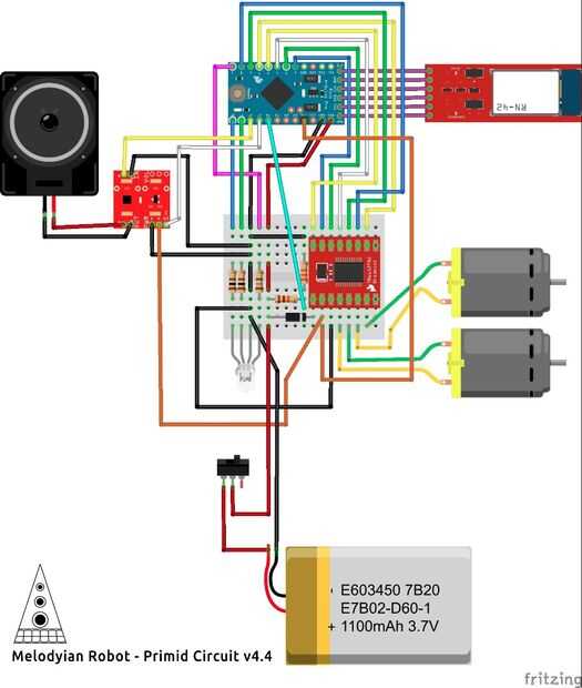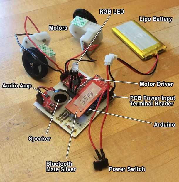 Usando los diagramas de circuito y la imagen como referencia, conecte el interruptor de encendido, batería, motores, altavoz, LED y Bluetooth Mate plata transceptor a la PCB.